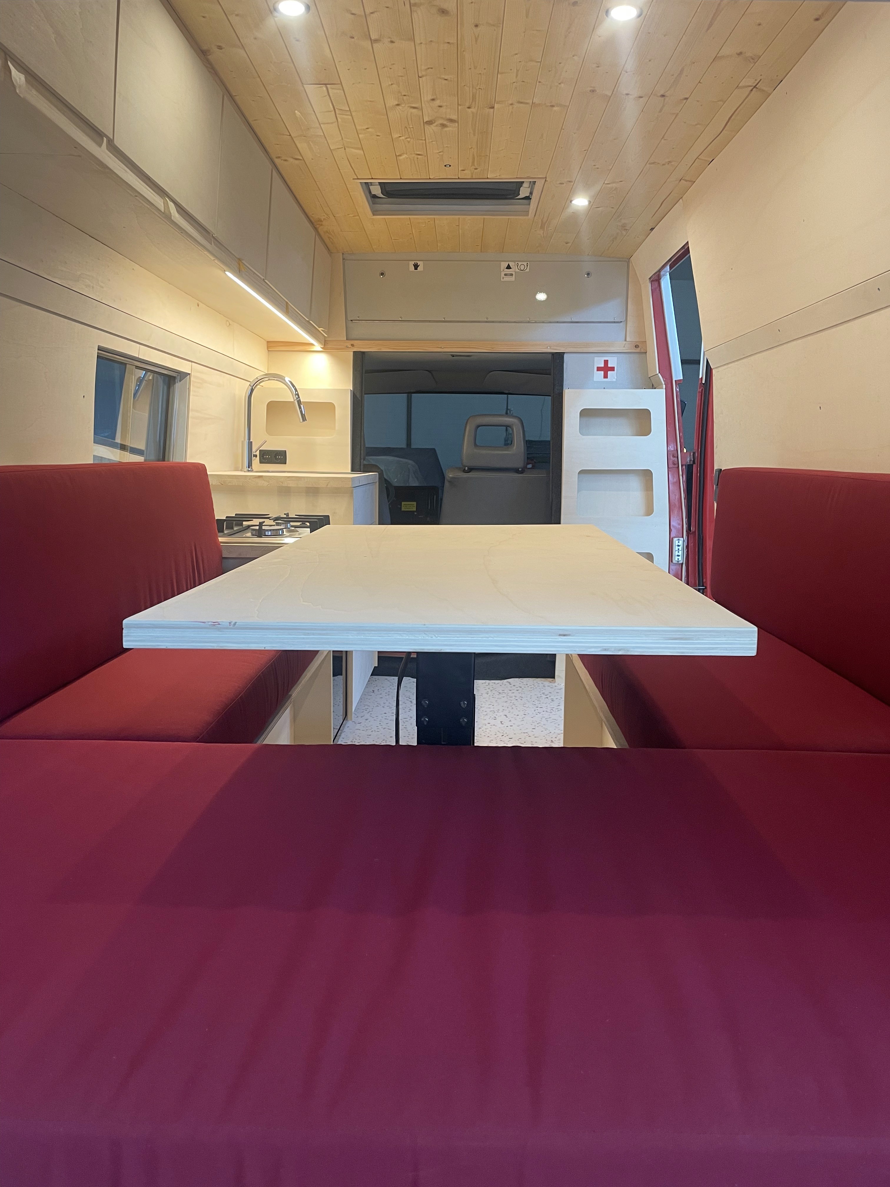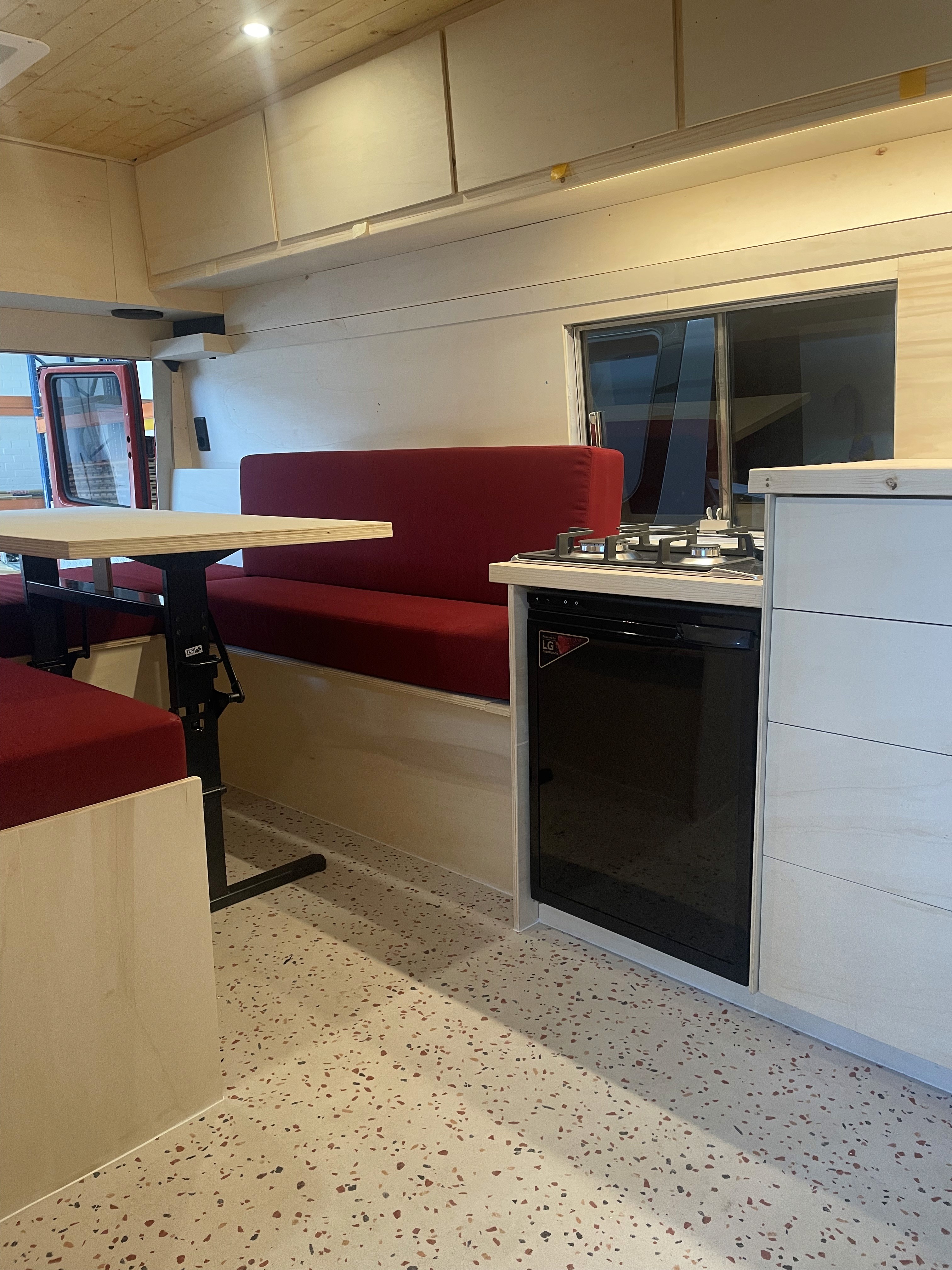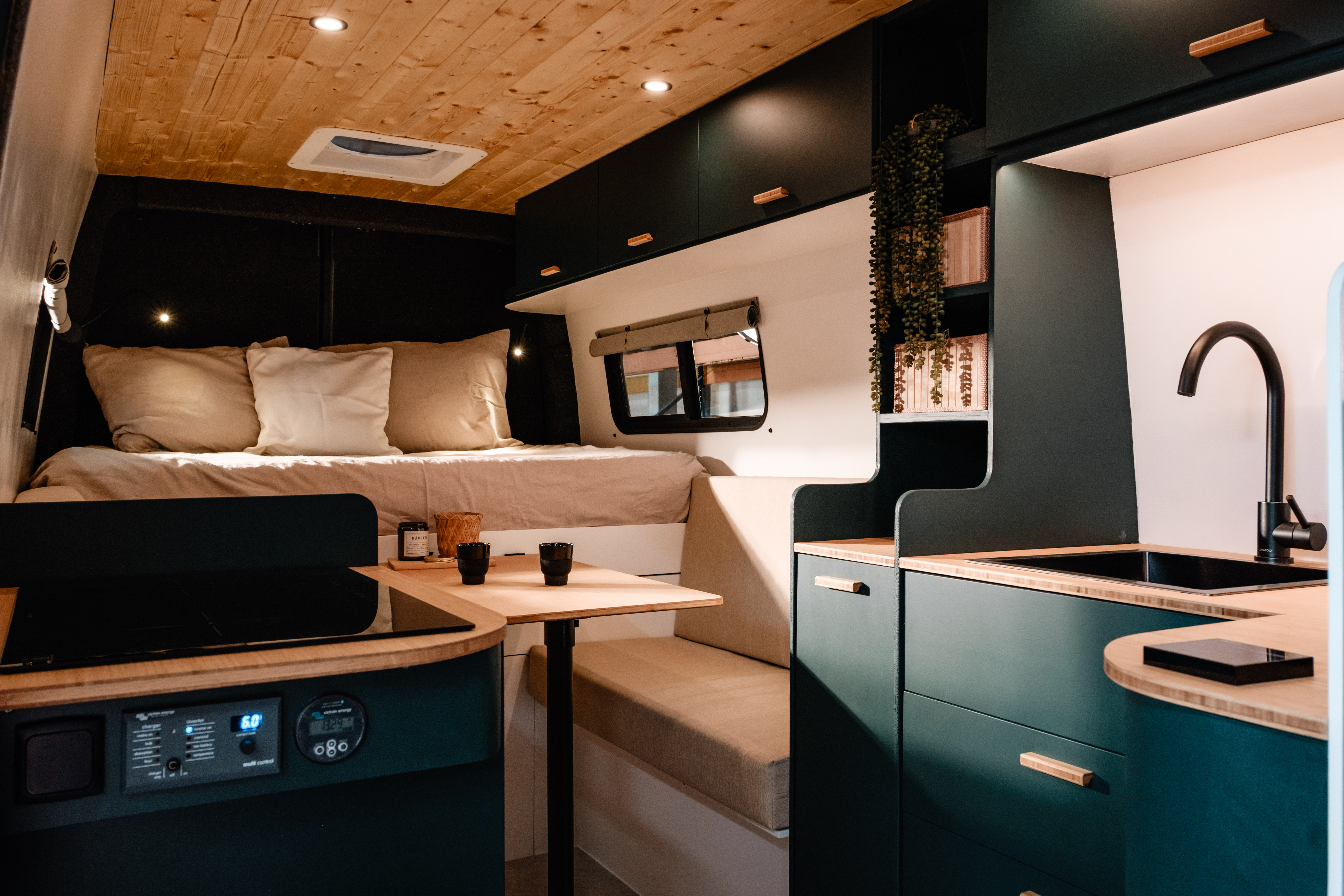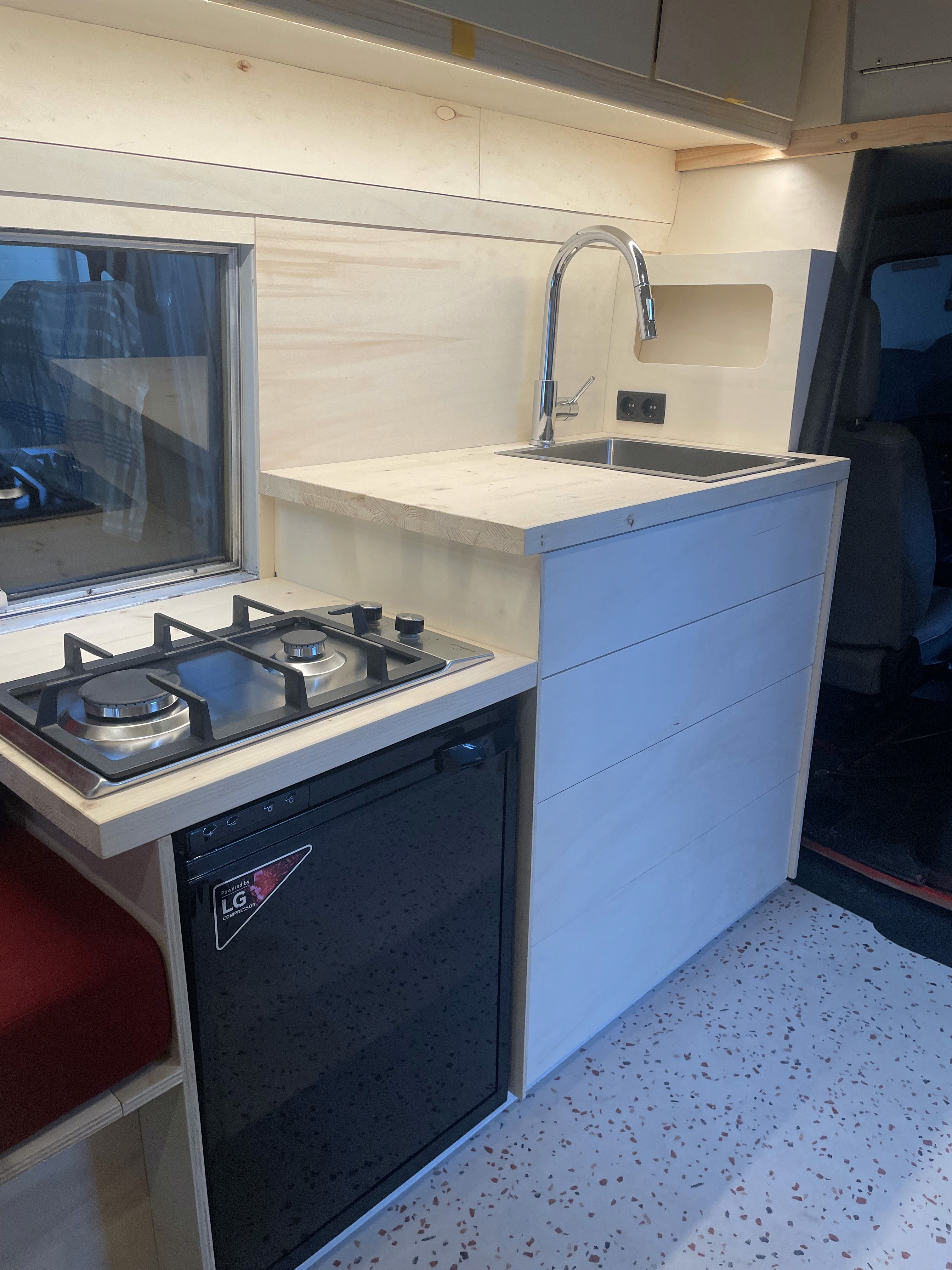 Een tof project voor een gezin met twee kinderen. Deze bestelbus toverden we om naar een hele toffe camper, inclusief off grid koken op inductie, twee extra zitplaatsen (RDW goedgekeurd) én een hefdak!